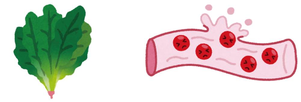ビタミンKは脂溶性ビタミンに分類されており、ほうれん草のような緑色の野菜に多く含まれています。食物からの摂取以外にも、ビタミンKを産生する腸内細菌の働きで腸の中でも作られています。ビタミンKは、血液が固まる際に必要不可欠な凝固因子の産生に深く関係しています。凝固因子が不足すると、外傷などの原因がなくても出血を起こしやすくなります。したがって、ビタミンKは正常な止血作用を保持するためにとても大切な物質です。その他、骨の成長過程にも重要であると考えられています。
